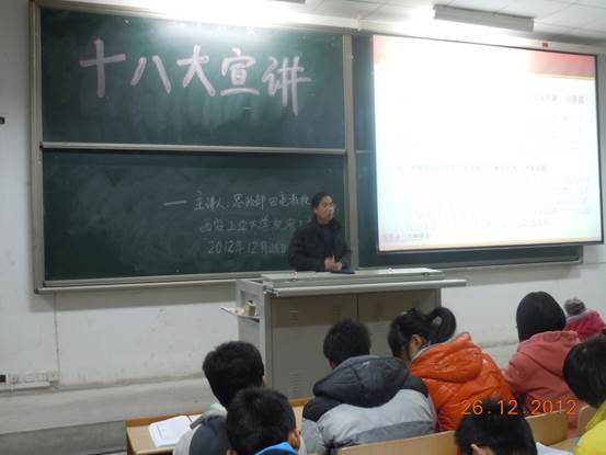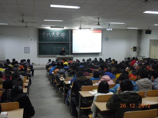 田亮教授以“十八大的理论创新”为题,分析讲述了十八大的理论创新成果,既有高度的理论剖析,又有现实的例证说明,深入浅入,生动翔实。报告中,田教授首先分析了十八大报告的四个鲜明特点:蕴含丰富,大气磅礴;方向明确,信心坚定;布局清新,任务明确;开拓进取,锐意创新。田亮教授接着从中国特色的社会主义经济建设、政治建设、文化建设、社会建设、生态建设等方面全面分析讲述了十八大的理论创新。整个宣讲会,热情激昂,大家在这种和谐气氛中很好地学习了十八大精神。