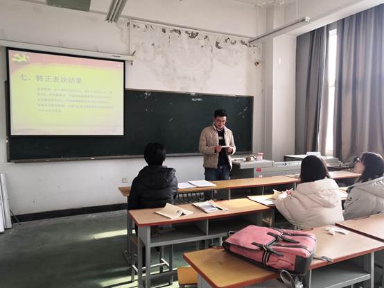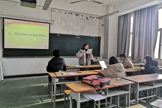 唐雅莉介绍了预备党员转正的流程和表决原则。在庄严的《国际歌》中开始了本次大会。陈苗苗等3名预备党员依次宣读转正申请书,对预备期一年内自己的工作、生活、思想、学习等情况做出了总结,并正确的认识了自己的缺点与不足,表明成为一名正式党员后,将不断地改善自身、提升自我。在场的党员对3名转正申请人的转正申请分别进行讨论并发表了自己的看法。最后,支部所有正式党员逐一进行表决,表决结果为同意陈苗苗、刘明月、张继霞3位预备党员按期转为中共正式党员。