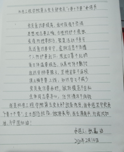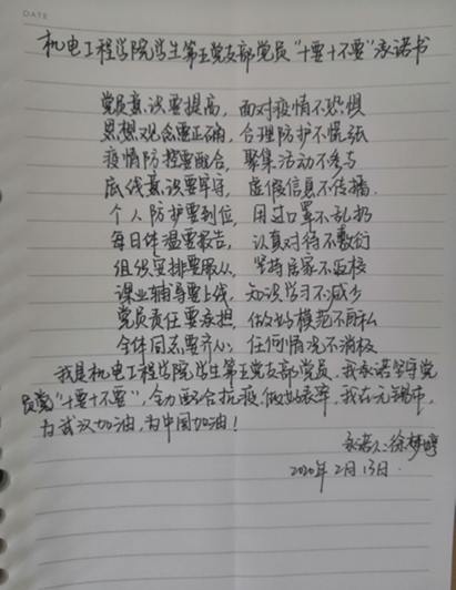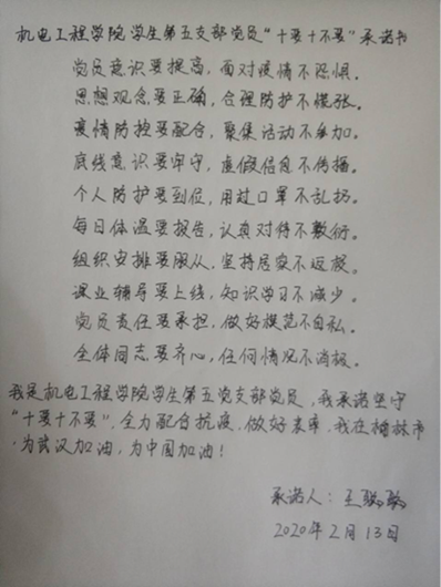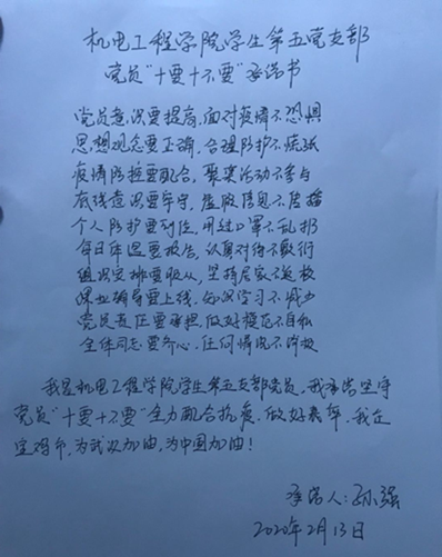 支部书记黄彦军、支委会成员王聪聪和党员代表张嘉怡共同拟定了best365官网员工第五党支部党员“十要十不要”承诺书。王聪聪同志代表支部全体党员宣读best365官网员工第五党支部防范疫情“十要十不要”承诺书。全体党员手写承诺书并签字。