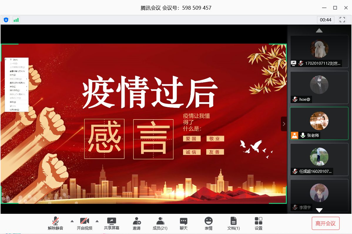 随后,李澄宇同志讲述了同班同学刘尧为抗疫贡献自己一份力的感人故事,并且深有感触;他讲到,疫情期间全国上下一心共同抗疫,为了保证满足各乡镇消毒液的供应,刘尧同学及其家里人在克服了原材料不足,需求量大等等困难之后生产出了可以满足周围各乡镇的消毒液,并无偿提供给了这些乡镇使用,这种在危难之际为国家、社会贡献自己一份力量的事迹令每一个人都为之动容,使每一位支部党员深刻认识到身为一名党员,要发挥党员精神,为抗疫做出力所能及的事情。接着,刘世博同志也讲述了自己身边同学的抗疫事迹,他了解到宋锦江同学在疫情期间为社区抗疫工作做出的贡献,宋锦江同学的母亲在疫情期间一直在抗疫一线工作,而宋锦江看到母亲早出晚归,为了分担母亲身上的重任,以及自己心中为社区抗疫奉献自己一份力量的心意,也投入到了社区抗疫工作的一线,同时宋锦江的工作也得到了社区邻居的认可。