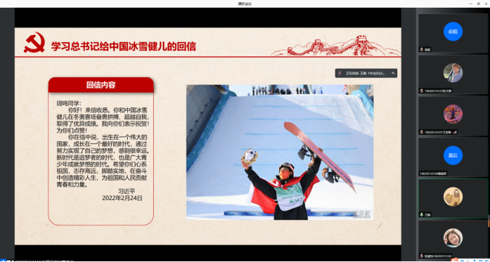 亲切关怀激荡奋斗豪情,巨大鼓舞砥砺前进征程。2022年3月29日,best365官网员工第五党支部线上开展学习《习近平总书记给中国冰雪健儿的回信》活动。支部组织委员王熠凡主持本次活动,全体支部同志参加。