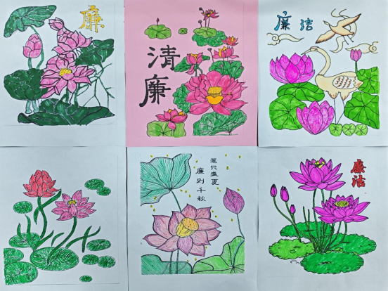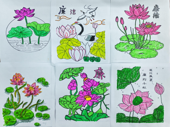 活动结束后,一幅幅完成上色的“廉洁莲画”被集中展示,构成了一道独特的“清风画廊”,成为教室中亮丽的风景线。