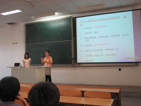 大会开始后,张晖老师首先向与会人员简单总结了公司去年的实践活动基本情况,并肯定了实践活动成果,但同时也提出了一些指导意见。张老师建议同学们要围绕3大主题——光辉党旗引领成长、志愿服务共享和谐、创新争优促进发展开展实践活动。同时,他还强调了老员工暑期社会实践的重要性,鼓励老员工要珍惜这种实践机会,在活动中有所收获,满载而归。最后,张晖老师还讲解了暑期社会实践的一些注意事项,针对大一员工第一次接触到暑期社会实践,他特别从社会实践当中的三个问题“怎样联系社会实践地点?”“怎样设计社会实践策划?”“怎么填写社会实践表?”做了详细介绍。