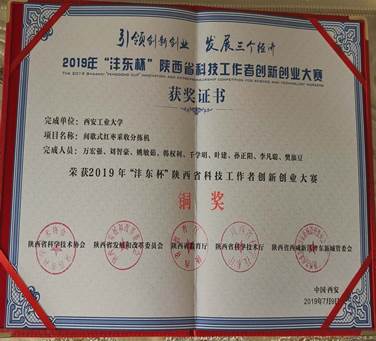 2019年7月8日至9日,“沣东杯”陕西省科技工作者创新创业大赛决赛在西咸新区举办,best365官方网站共有5个项目入围,经过激烈角逐,公司万宏强团队的“间歇式红枣采收分拣机”项目以及田军委团队的“带机械臂的水下作业机器人”项目双双获得铜奖。