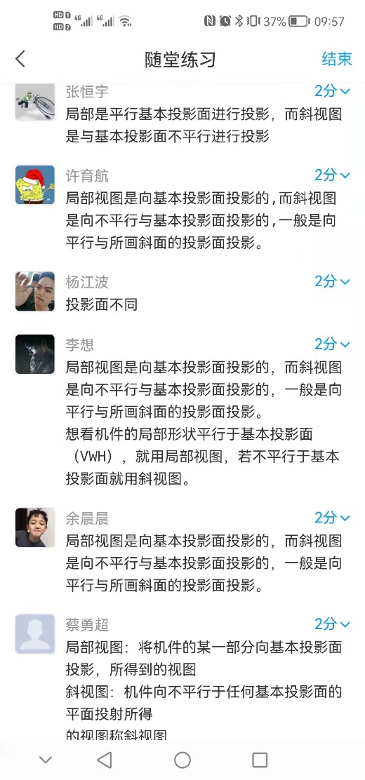 融入方法:在机件形状的表达方法中, 为了加深员工对基本视图、向视图、局部视图、斜视图的理解。通过学习通软件的“课堂练习”模块,发布题目,让员工们比较向视图与斜视图、局部视图与斜视图的不同,进一步加深员工对视图的理解。同时培养员工“通过对比,透过现象看本质”的钻研能力。