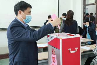 受疫情影响,best365官网换届选举工作安排在宽敞的工2-504会议室,现场设置入口引导标识,各部门提前引导师生分流,保证会场人员不扎堆。现场工作人员认真清点人数和选票,并将选票一一分发到选民手中。认真听取选举有关事宜的说明及代表候选人情况后,在现场监票人员地见证下,路金龙等教师代表选民和陈星等员工选民依次走到投票箱前,郑重投下神圣的一票。