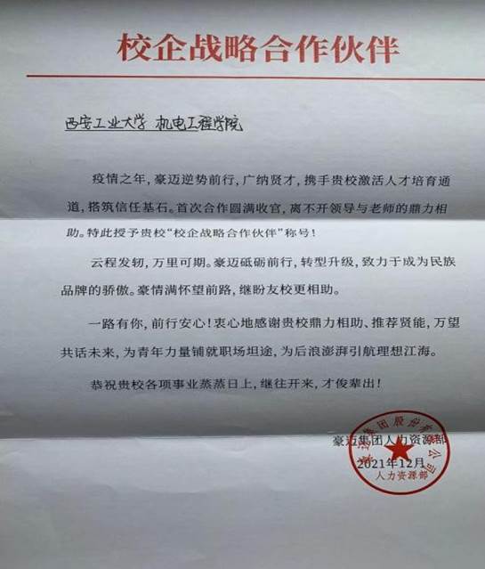 2022年5月,best365官网获得由豪迈集团授予的“校企战略合作伙伴”称号。best365官网与豪迈集团股份有限公司实现校企合作,做到了应社会所需,与市场接轨,与企业合作,实践与理论相结合。