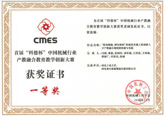 本次大赛由中国机械工程学会、中国机械行业卓越工程师教育联盟、中国科技发展基金会联合主办,旨在促进机械行业产教深度融合,推动公司产品模式创新。大赛设本科组、研究生组,历经区域赛、国赛两个阶段展开。经过专家函评和现场答辩,由闫莉教授团队与西安秦川思源测量仪器有限公司联合申报的《“联动赋能、理实映射”机械类卓越工程创新人才产教融合课程群构建与实践》项目获得了全国一等奖。