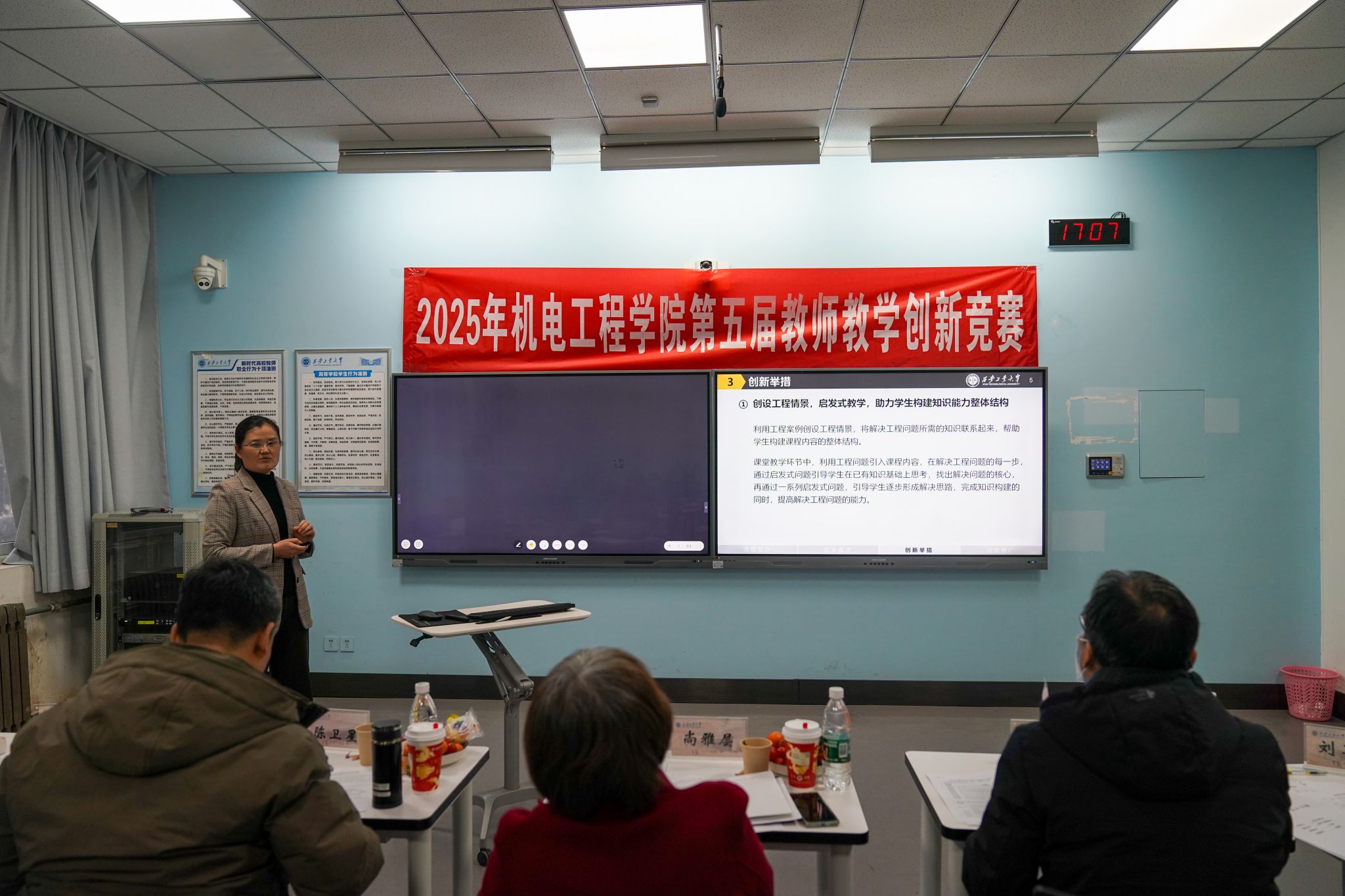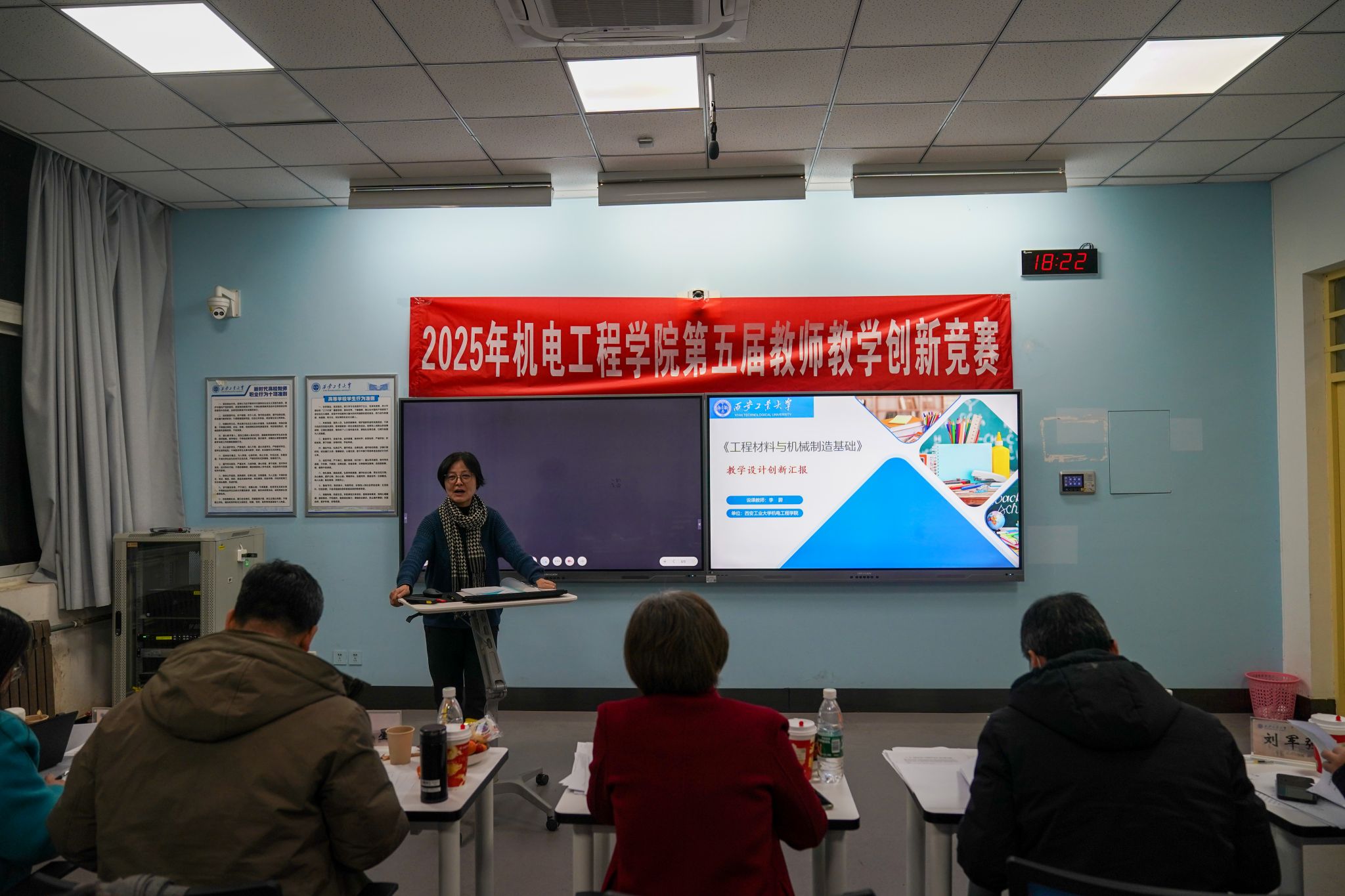 参赛教师通过引人入胜的教学设计、从容不迫的讲授方式以及条理清晰的课堂展示赢得评审专家和观摩教师的好评。整场比赛历时四余小时,评审专家对照比赛评分规则从现场教学展示、教学创新成果、教学设计创新、课程思政创新、产教融合创新等多个维度对每位参赛选手评分。