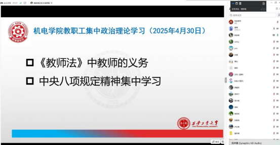 会议伊始,程新峰点明学习主旨,强调中央八项规定精神是作风建设的重要准则,《教师法》是规范教师职业行为的法律基石,二者相辅相成,对营造风清气正的教育生态、推动公司高质量发展具有深远意义。全体教师要以此次学习为契机,深刻领会法规纪律内涵,切实将其转化为履职尽责的行动自觉。
