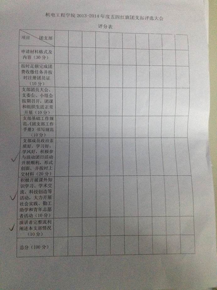 41日下午5时,院团委组织部在工2-502召开“五四评优”中集体奖之五四红旗团支部评优会。院团委书记刘璐老师、团委副书记王瑞旭、组织部长何紫雅、宣传部长贾萌、王卓及优秀学长李月月担任评委,组织部全体干事和各团支部代表及亲友团到场观摩,评选现场热烈有序。