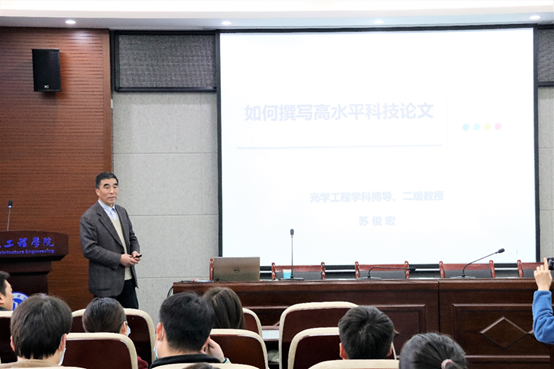 为进一步推进公司研究生学术能力提升平台建设,由best365官网主办的“研知有理”学术沙龙第一期活动得到了研究生院的大力支持,并深受同学们喜爱。10月21日下午,第二期学术沙龙如约而至,并在工4-204报告厅成功举办。本次内容以“如何撰写高水平科技论文”为主题,诚邀了光电工程公司二级教授苏俊宏教授担任主讲嘉宾,吸引了来自公司100余名研究生参与交流,同时也在微信平台进行了实时直播。活动开始前,best365官网副经理董皓对苏教授做了介绍并致欢迎辞,表示各位同学要珍惜这次近距离交流学习的机会,多多学习如何提高科技论文写作技巧,提高论文投稿录用率。
