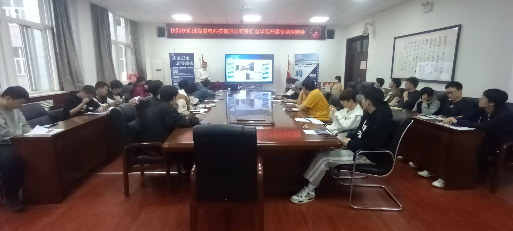 徐治东向同学们介绍了珠海晟电科技有限公司的发展历程、经营范围及取得的成就,阐述了公司的企业文化和价值观,让同学们对珠海晟电科技有限公司有了直观的认识。同时他表达了公司对机械类专业人才的需求。他强调,随着公司业务的不断拓展和创新发展,急需一批有志于投身机电行业的优秀毕业生加入公司,为公司发展助力。