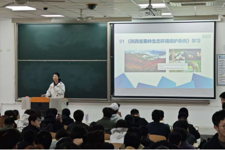 辅导员带领全体员工学习《陕西省秦岭生态环境保护条例》,结合秦岭生态保护区实例,阐释生态环境保护的法律责任,强化员工生态文明实践意识。
