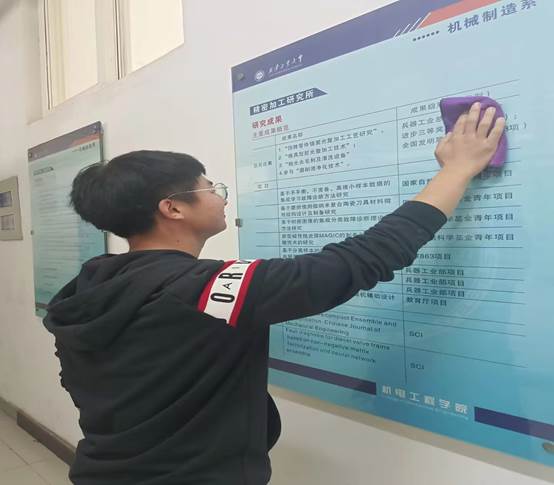 3月27号中午,参加活动的同学们,提前做好了各种准备,并且都满怀热情在工科二号楼等待着安排。在员工干部的带领下,大家拿起抹布,提起扫帚,分工合作,配合默契,共同清扫了大楼的各个角落。在大家的共同努力下,让大楼焕然一新。不仅如此,同学们在一起劳动中还收获了许多宝贵的经验,锻炼了自己。